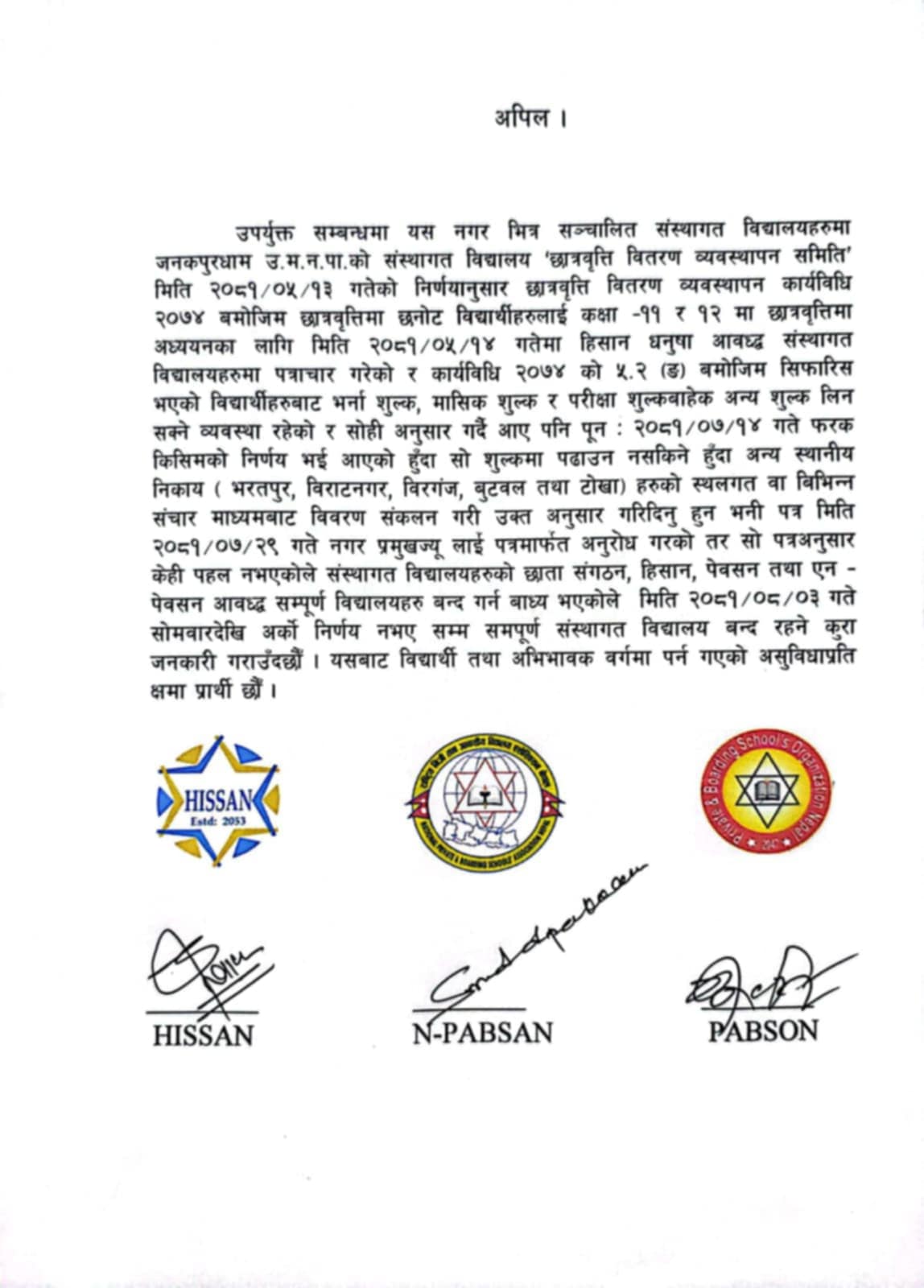 हिसान, प्याब्सन तथा एनप्याब्सनले संयुक्त विज्ञप्ति जारी गर्दै उपमहानगरले आफूहरुको माग कार्यान्वयन नगरेसम्म विद्यालयहरु बन्द रह्ने जनाएको छ । विज्ञप्तिमा भनिएको छ ‘नगर भित्र सञ्चालित संस्थागत विद्यालयहरुमा ’छात्रवृत्ति वितरण व्यवस्थापन समिति’ मिति २०८१÷०५÷१३ गतेको निर्णयानुसार छात्रवृत्ति वितरण व्यवस्थापन कार्यविधि २०७४ बमोजिम छात्रवृत्तिमा छनोट विद्यार्थीहरुलाई कक्षा ११ र १२ मा छात्रवृत्तिमा अध्ययनका लागि मिति २०८१/०५/१४ गतेमा हिसान धनुषा आवद्ध संस्थागत विद्यालयहरुमा पत्राचार गरेको र कार्यविधि २०७४ को ५.२ (ङ) बमोजिम सिफारिस भएको विद्यार्थीहरुबाट भर्ना शुल्क, मासिक शुल्क र परीक्षा शुल्कबाहेक अन्य शुल्क लिन सक्ने व्यवस्था रहेको र सोही अनुसार गर्दै आए पनि पून २०८१/०७/१४ गते फरक किसिमको निर्णय भई आएको हुँदा सो शुल्कमा पढाउन नसकिने भएकाले यसलाई सच्याउन उपमहानगरलाई पत्रमार्फत आग्रह गरिएको थियो ।’ यद्यपि उपमहानगरपालिकाले पत्रअनुसार केही पहल नगरेकाले सम्पूर्ण निजि विद्यालय मंसिर ३ गतेदेखि बन्द गर्न बाध्य भएका छौँ विज्ञप्तिमा भनिएको छ ।