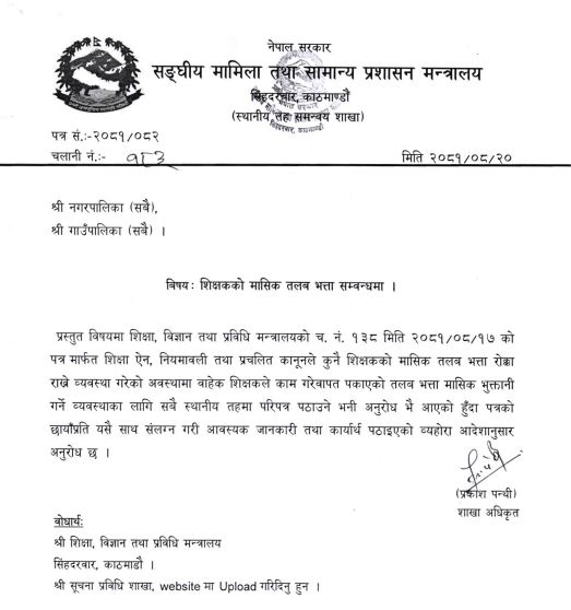 संघीय मामिला तथा सामान्य प्रशासन मन्त्रालयले शिक्षकको तलब मासिकरूपमा उपलब्ध गराउन सबै स्थानीय पालिकालाई पत्राचार गरेको छ ।