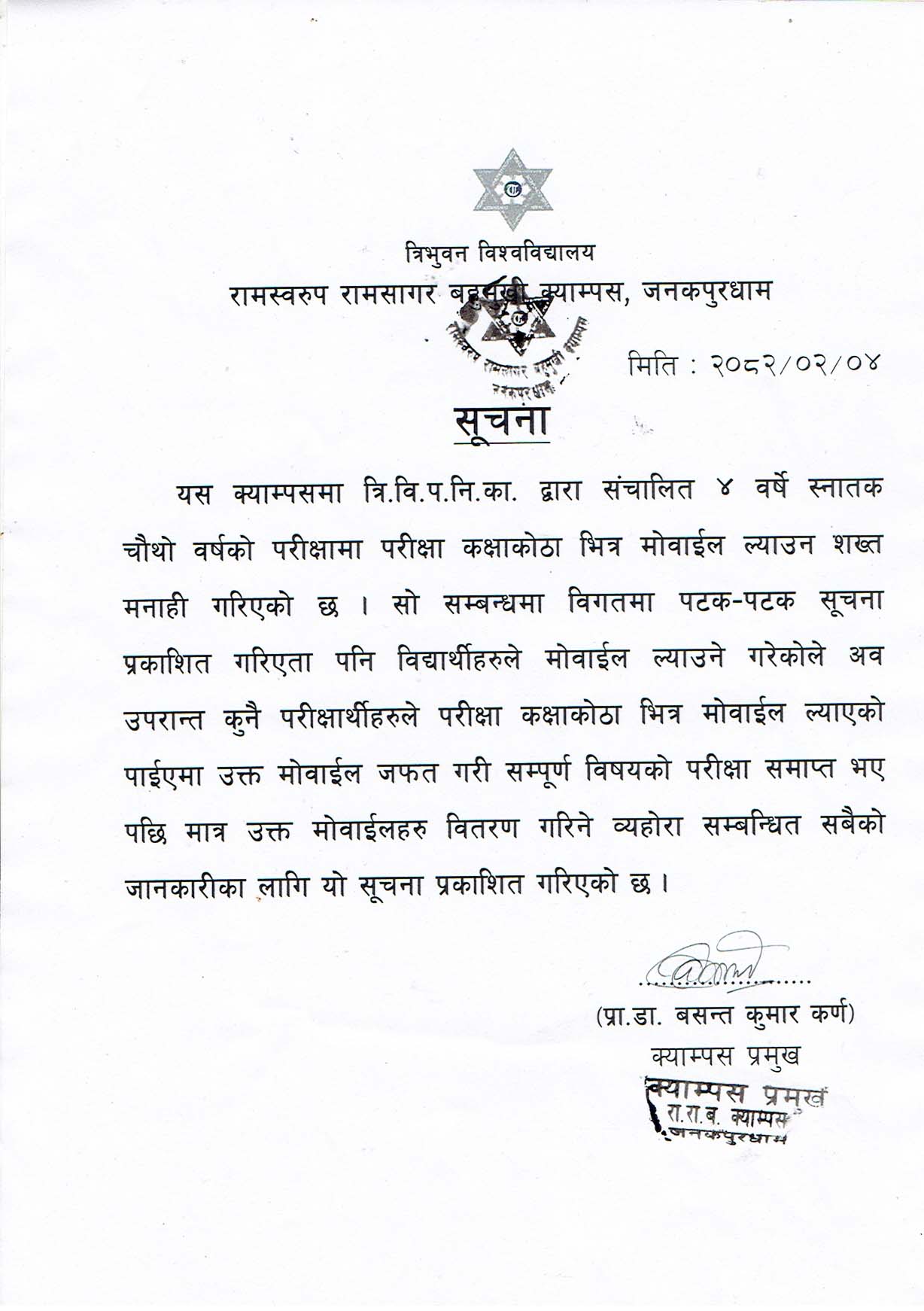 क्याम्पस प्रमुख प्रा. डा. बसन्तकुमार कर्णले आज सूचना जारी गरी ४ वर्षे स्नातक तहको चौथो वर्षको परीक्षामा परीक्षा कोठा भित्र मोबाइल ल्याउन सख्त मनाही गरिएको जनाएका छन् ।