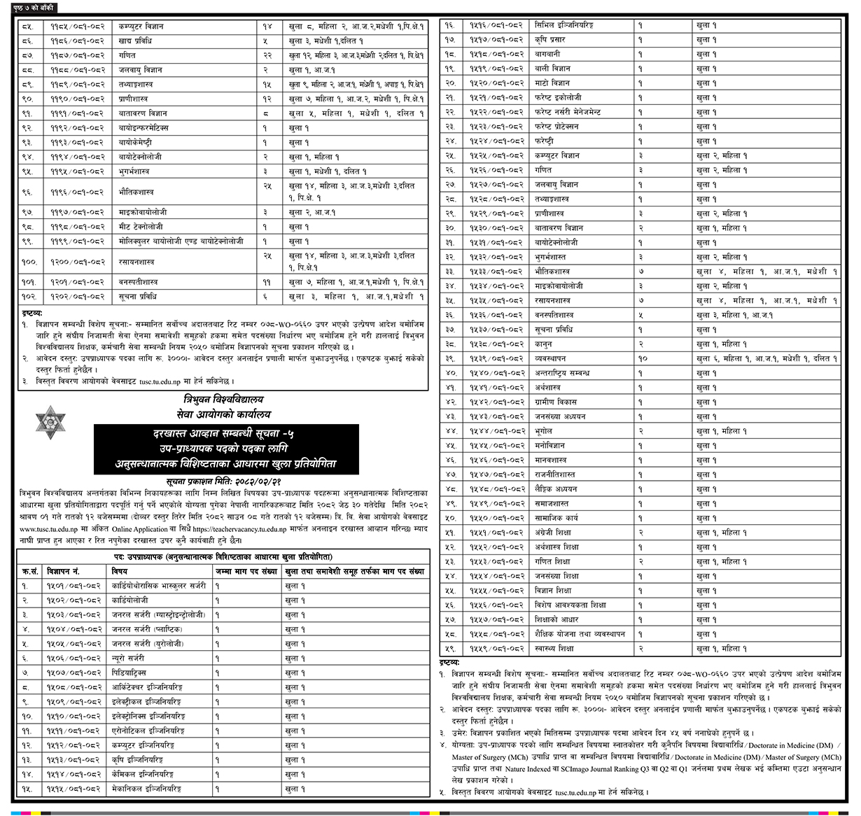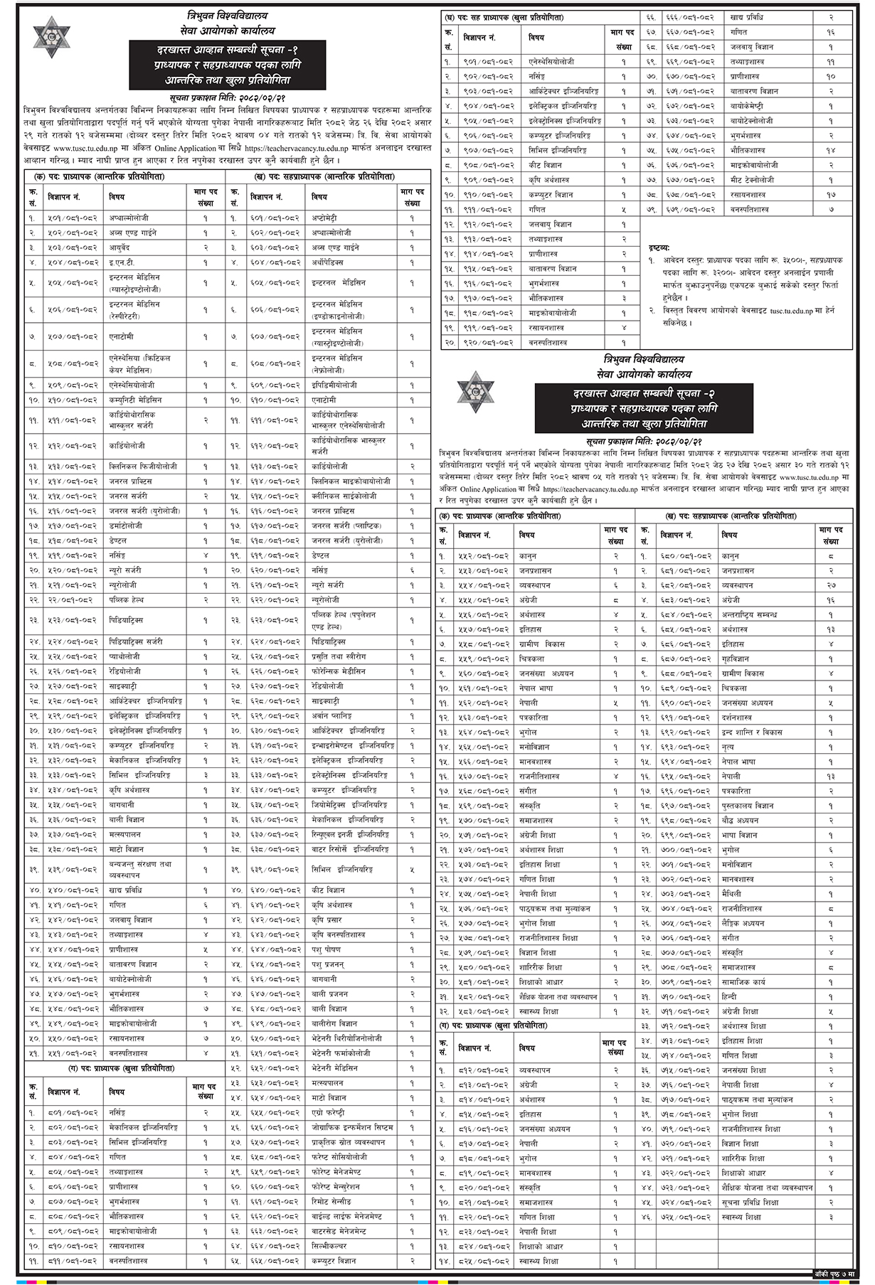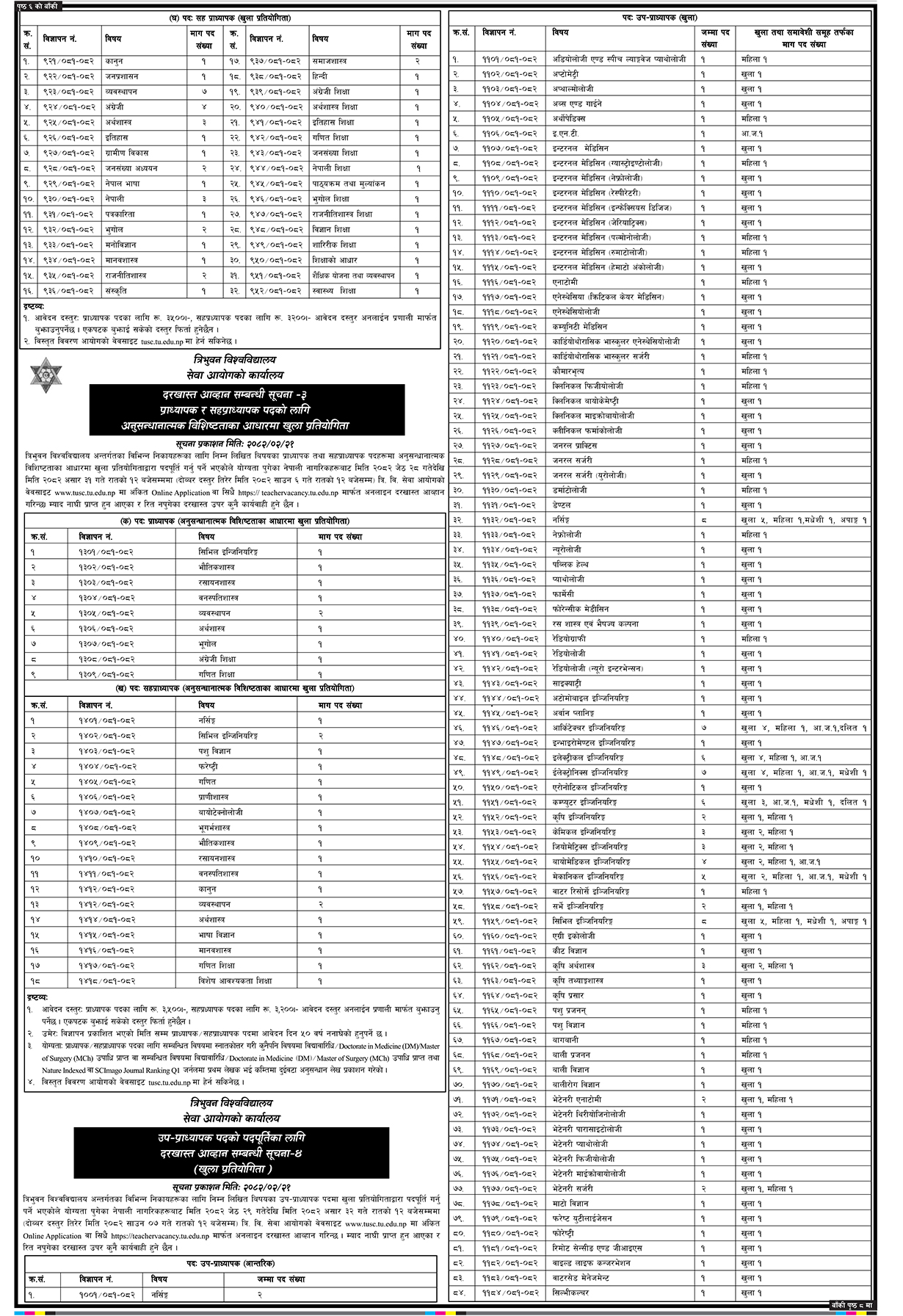 विभिन्न विषयका प्राध्यापक र सहप्राध्याक पदमा आन्तरिक तथा खुला प्रतियोगिताबाट पदपूर्ति गर्नका लागि त्रिविले विज्ञापन खुलाएको छ ।