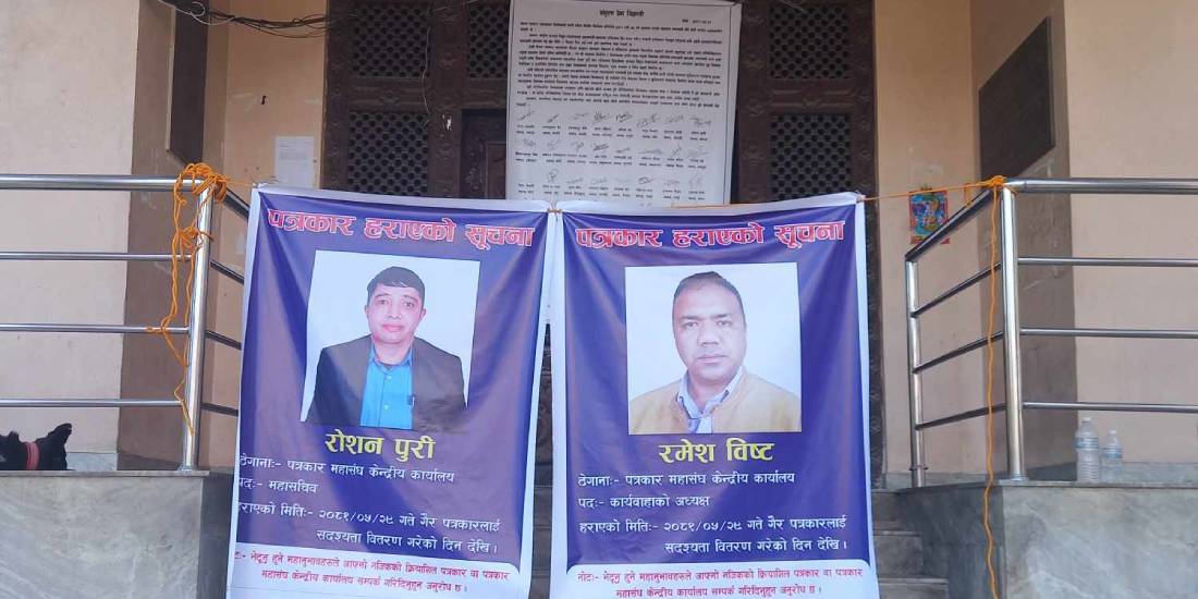 काठमाडौं । नेपाल पत्रकार महासंघका कार्यवाहक अध्यक्ष रमेश विष्ट र महासचिव रोशन पुरी हराएको सूचना महासंघको कार्यालयमा नै टाँसिएको छ । सञ्चारग्राममा रहेको महासंघको कार्यालयमा […]