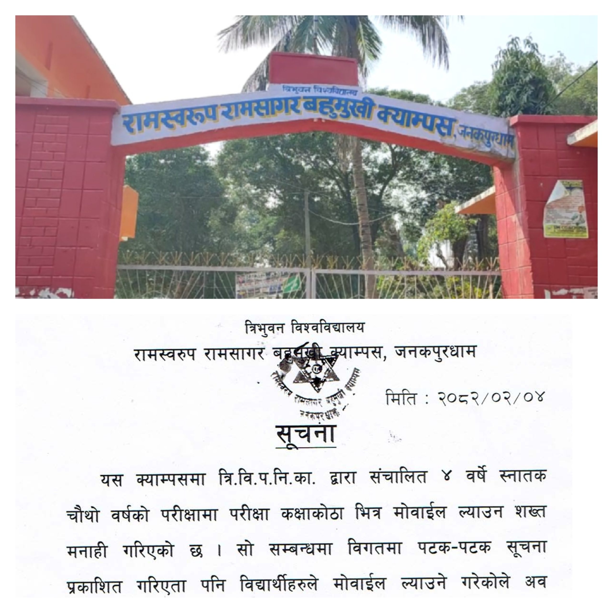 जनकपुरधाम । जनकपुरधामको रामस्वरुप रामसागर बहुमुखी क्याम्पसमा हुने परीक्षाहरुमा मोबाइल प्रवेशमा रोक लगाएको छ । क्याम्पसमा हुने परीक्षामा हुने चोरीलाई लिएर निकै आलोचना भइरहेको बेला […]